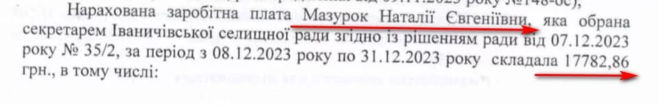 Секретарка селищної ради Наталія Мазурок за три тижні на новій посаді в грудні отримала 17 тисяч 783 гривні заробітної плати. З них: 4 тисячі 994 гривні – надбавка за високі досягнення в праці та 2 тисячі 800 гривень – премії.