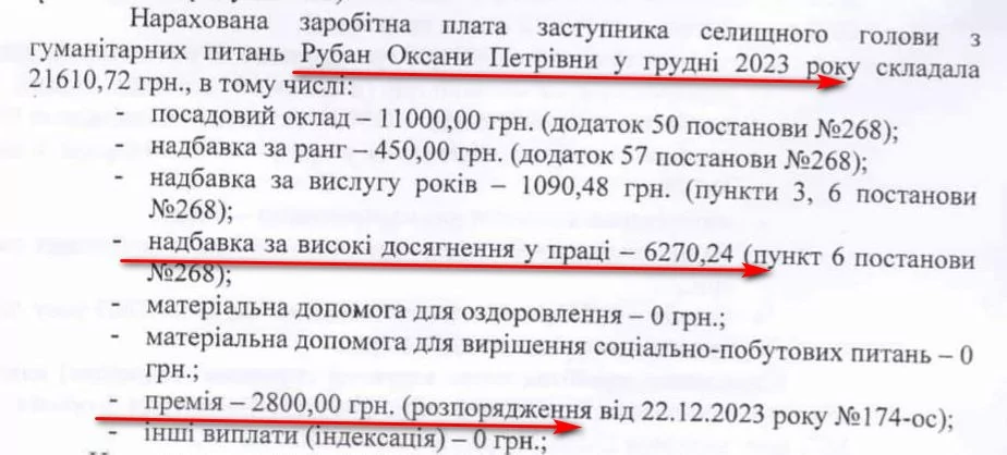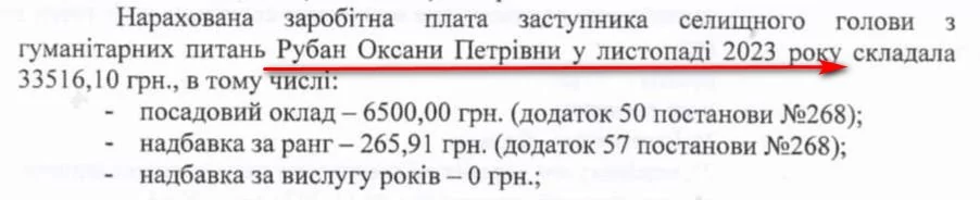 Заступниця з гуманітарних питань Оксана Рубан за листопад-грудень отримала 55 тисяч 127 гривень. Виплатили чиновниці й надбавку за високі досягнення в праці – 9 тисяч 653 гривні. Найвідданішій соратниці Томашевської, як її називають в громаді, в листопаді нарахували ще 17 тисяч 293 гривні премії, 2 тисячі 857 гривень – відпускних та 3 тисячі 217 гривень відрядних. В грудні Рубан дали 2 тисячі 800 гривень премії.