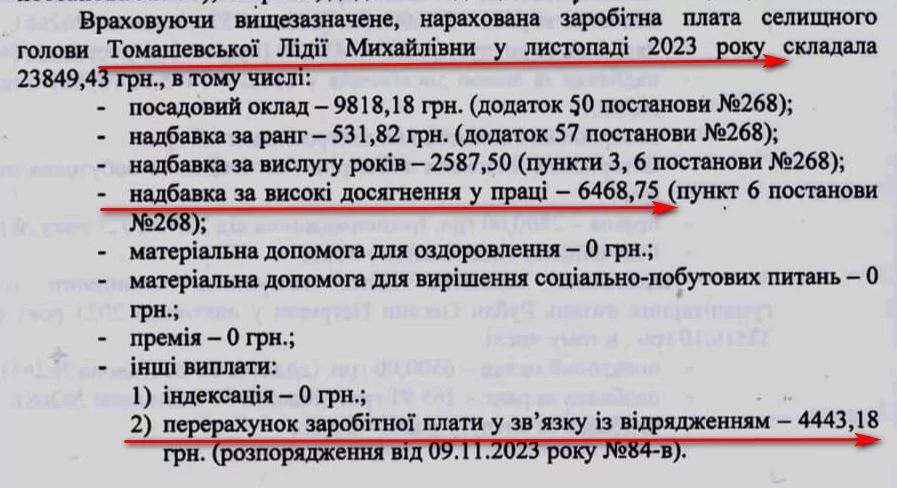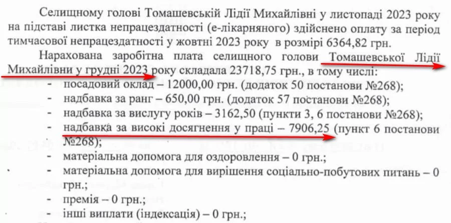 Відповідно до отриманої інформації, очільниця громади Лідія Томашевська за два місяці отримала 47 тисяч 568 гривень. Зокрема, середньомісячна виплата чиновниці склала майже 24 тисячі гривень. Крім посадового окладу їй виплачували надбавки за ранг, вислугу років та високі досягнення у праці. Найцікавіше те, що щомісячно Томашевська отримує майже 8 тисяч гривень надбавки за високі досягнення в роботі.