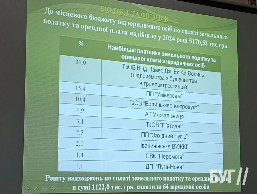 До місцевого бюджету від юридичних осіб по сплаті земельного податку та орендної плати надійшло у 2024 році 5170,52 тис.грн. У 2024 році єдиного податку надійшло до місцевого бюджету 10 658,0 тис грн. Неподаткових надходжень до громади надійшло 2 024,3 тис.грн.”, – проінформувала Томашевська.