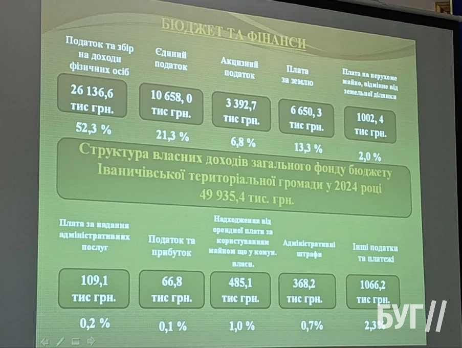 “Найвагомішим джерелом надходжень до загального фонду бюджету є податок та збір на доходи фізичних осіб 26 136,6 тис.грн. (в тому числі ПДФО із заробітної плати – 22 343,8 тис.грн.). Акцизного податку до бюджету громади у 2024 році надійшло 3 392,7 тис.грн. Плата за землю у 2024 році (земельний податок та орендна плата з юридичних та фізичних осіб) склала 6650,25 тис.грн.