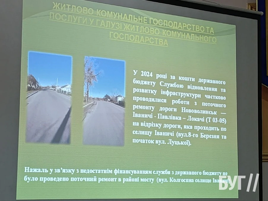 Йшлося у доповіді Томашевської і про ремонт дороги Грибовиця – Мишів – Іванівка на відрізку Мишів – Іванівка. Але ж роботи ініціювала Служба місцевих автомобільних доріг у Волинській області коштом обласного бюджету.