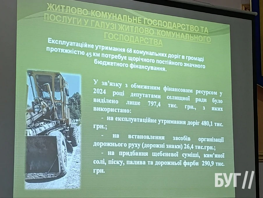 Що стосується місцевих доріг на які, нагадаємо, неодноразово нарікали місцеві мешканці, Томашевська визнала, що вони дійсно знаходяться в поганому стані. Однак повідомила, що в бюджеті громади для їх ремонту немає коштів. За її словами, єдине, що вдалося зробити минулого року – це виділити 480 тисяч гривень на експлуатаційне утримання доріг та ще майже 291 тисячу гривень – на придбання щебеневої суміші, кам’яної солі, піску, палива та дорожньої фарби.