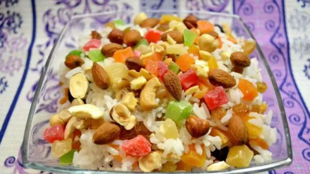 Окремо на сковорідці обсмажити горіхи, а потім подрібнити їх у блендері. Курагу нарізати на маленькі шматочки. Ананаси (можуть бути консервовані) нарізати кубиками. Мед розвести з узваром та додати в це горіхи, курагу та ананаси. Подаючи на стіл рис слід полити цим соусом. При бажанні можна додати інші екзотичні фрукти.