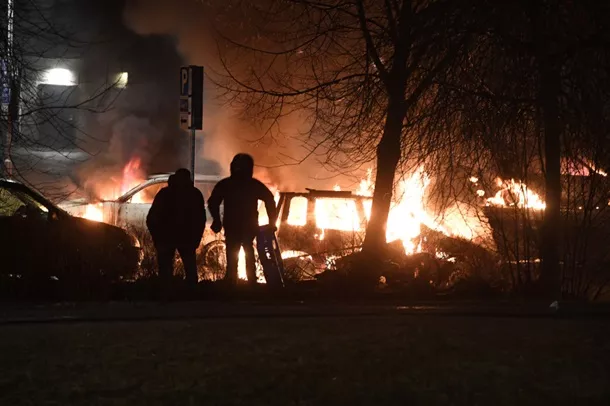 Невідомі ввечері 20 лютого спалили вісім автомобілів і розгромили кілька магазинів. Були побиті двоє людей, повідомляє Aftonbladet.
