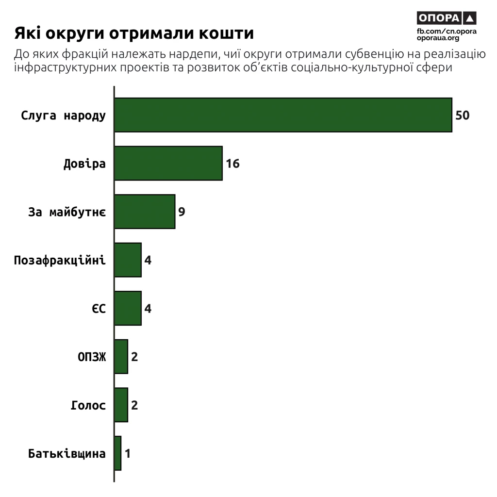 Втім, огляд голосувань у Верховній Раді демонструє, що округи депутатів, які отримали найбільшу кількість субвенцій, входять до фракції “Слуга народу” та групи “Довіра”. Вони найбільше підтримують ініціативи, які можна віднести до програми Володимира Зеленського та його партії.