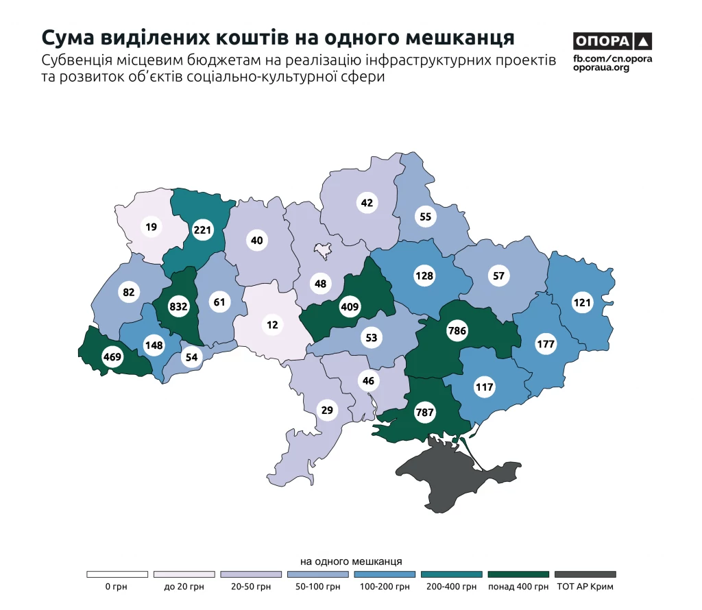 Додатково ОПОРА також визначила розподіл коштів субвенції у розрахунку на одного жителя кожної з областей, і отримала в результаті невідповідності у десятки разів. Так, на одного жителя Тернопільської області припало майже 832 грн, Херсонської — 787 грн, Дніпропетровської — 785 грн, Закарпатської — 468 грн, Черкаської — 409 грн.