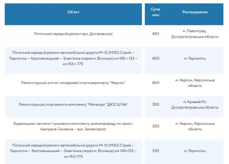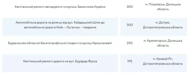 Загалом чотири з найдорожчих об’єктів були профінансовані в Дніпропетровській області, по два — в Донецькій, Тернопільській та Херсонській регіонах.