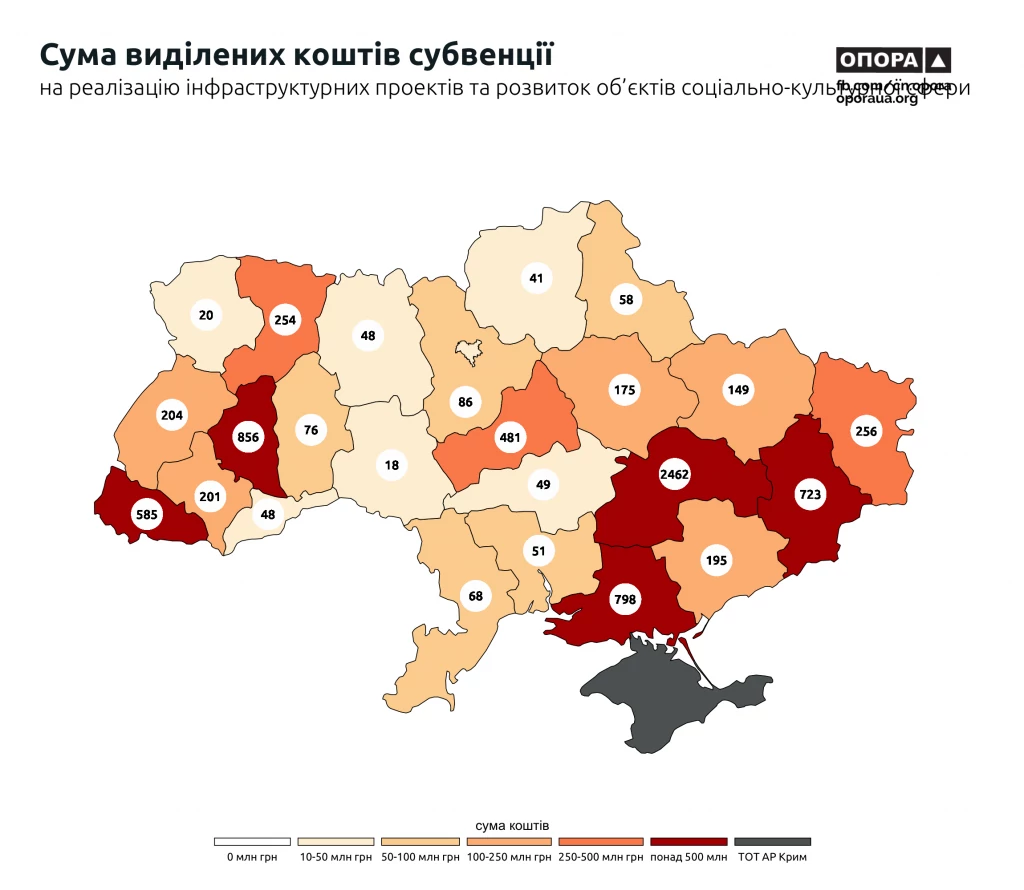 У межах цієї субвенції абсолютно рекордну кількість коштів було спрямовано до Дніпропетровської області — 2 млрд 462 млн грн або 31% від усієї суми, повідомляє ОПОРА.