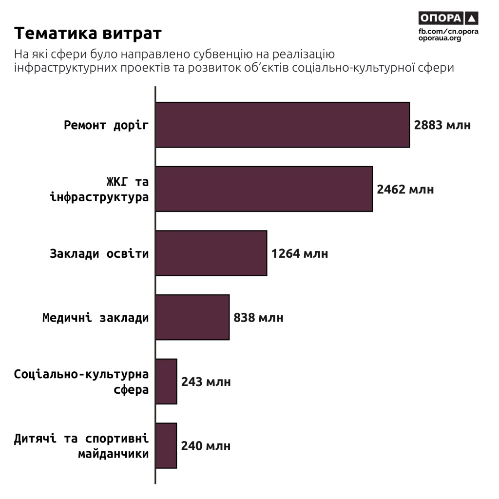 Найбільші витрати безпосередньо пов’язані з ремонтом доріг — 2 млрд 883 млн грн (40 об’єкт), на другому місці — об’єкти зі сфери благоустрою, ЖКГ та розвитку інфраструктури — 2 млрд 462 млн грн (61 субвенція). На ці два напрямки спрямовано понад ⅔ усіх коштів.