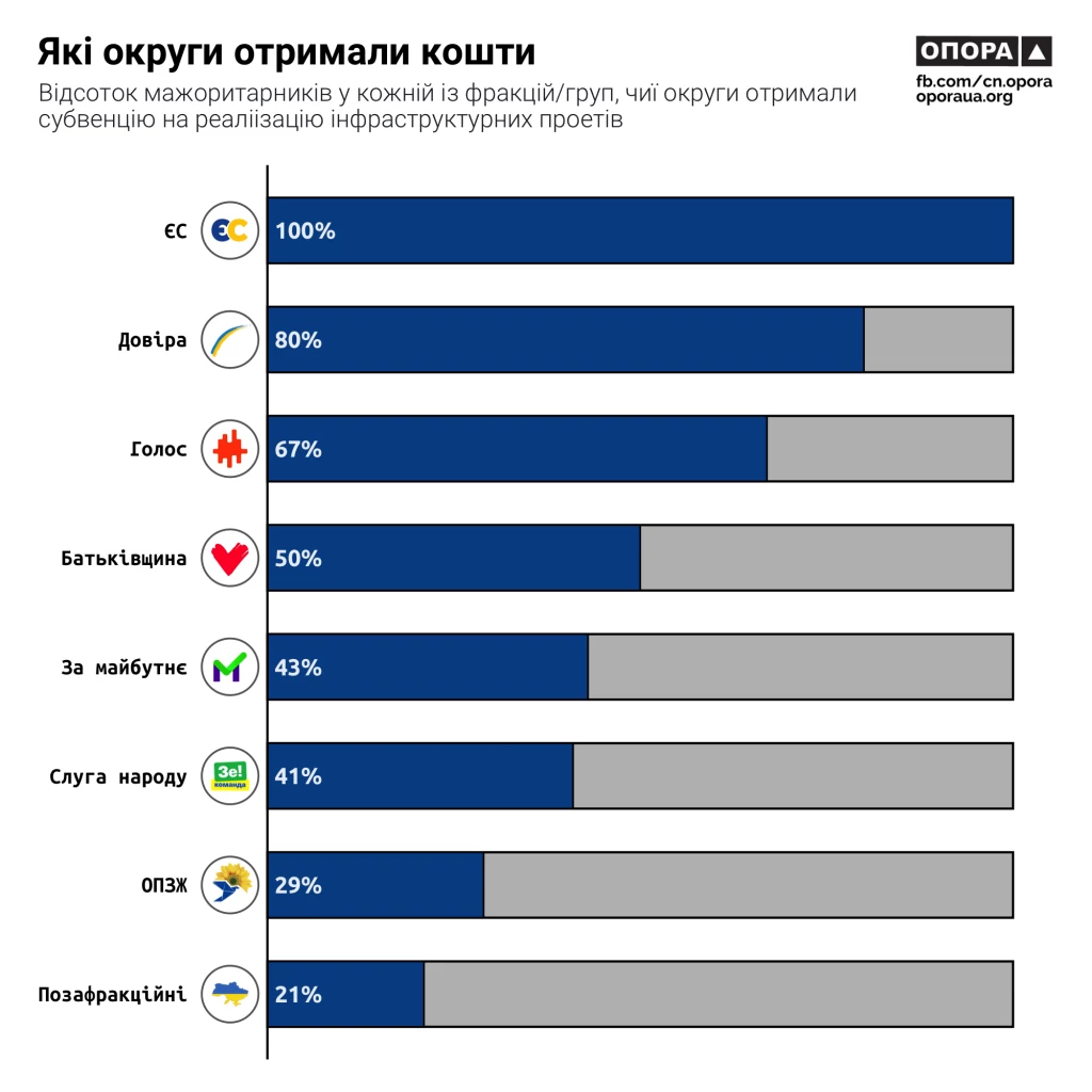Найбільшу кількість округів представляють депутати від “Слуги народу” — 50 (або 41% від усіх депутатів-мажоритарників фракції). На другому місці група “Довіра” — 16 округів (80%), на третьому — група “За майбутнє” — 9 (43%). Своєю чергою, по 4 округи (18,8%) представляють позафракційні нардепи та депутати від “ЄС” (100%), по два члени — “Опозиційну платформу — За життя” (28,6%) та “Голос” (66.7%), один — мажоритарник від “Батьківщини” (50%).