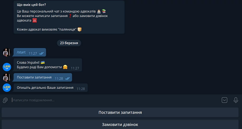 Окрім чат-бота, в якому можна спілкуватися письмово або попросити про дзвінок адвоката, є також телеграм-канал, де юристи розповідають про свою роботу та пояснюють найбільш значущі теми. Як сплачувати податки ФОПам, як отримати зброю, в чому різниця статусу біженця та тимчасового захисту в іншій державі, кому з чоловіків можна виїхати за межі України в умовах воєнного стану — адвокати надають консультації з цих та інших питань.