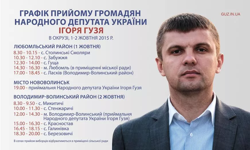 1-го та 2-го жовтня народний депутат України Ігор Гузь вестиме прийом громадян у Любомльському та Володимир-Волинському районах. 1 жовтня 8:30 -10:15 с. Столинські Смоляри Любомльського району (в приміщенні сільської ради) 10:30 - 12:10 - с. Забужжя Любомльського району (в приміщенні сільської ради), 12:30-14:00 – с. ...