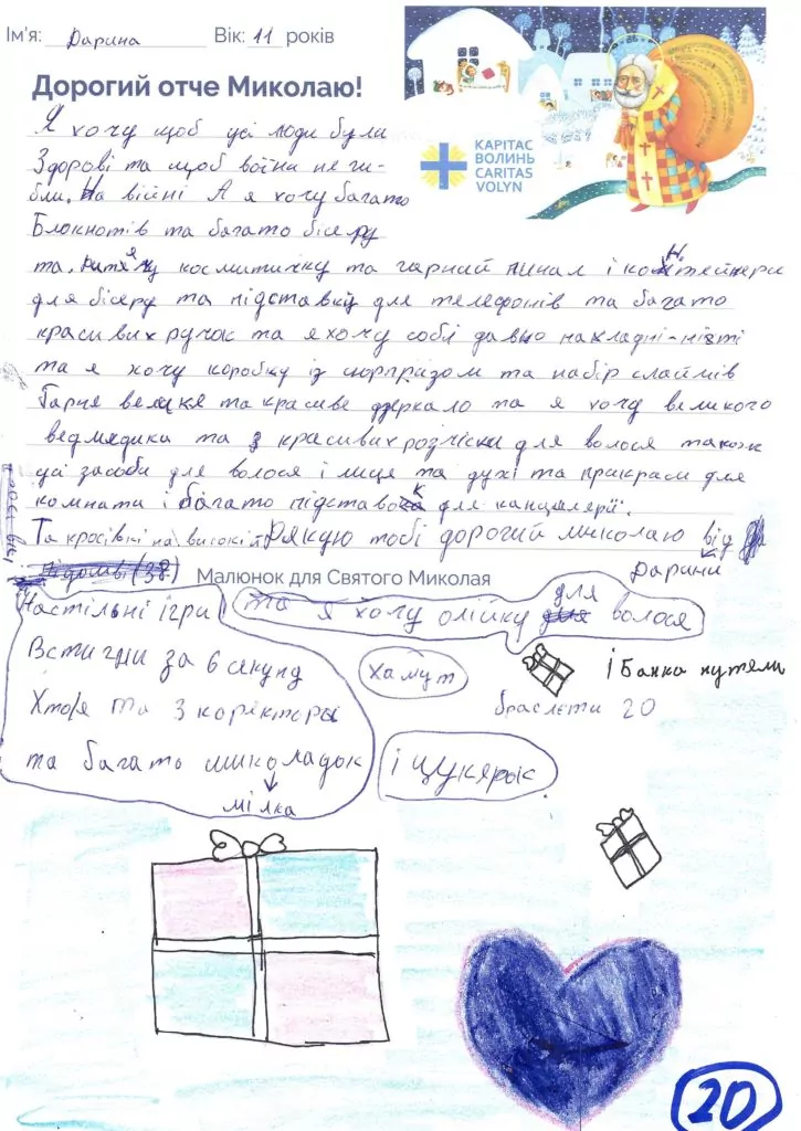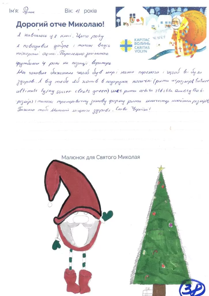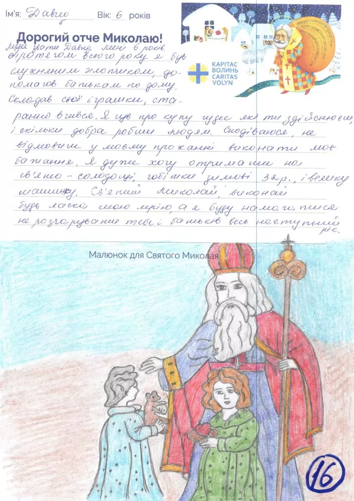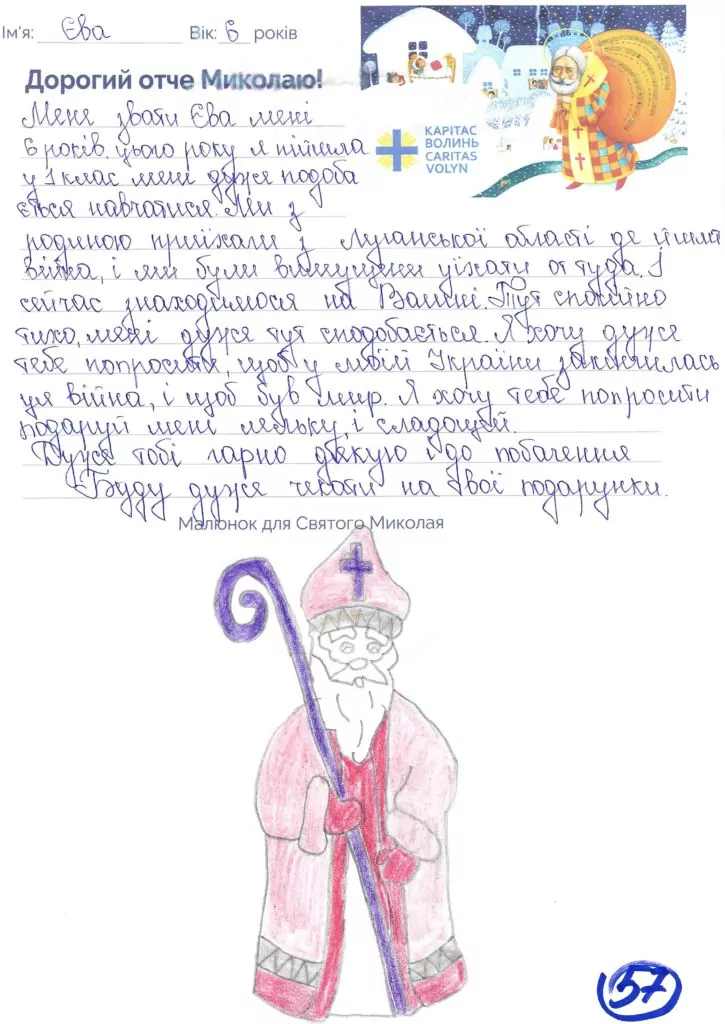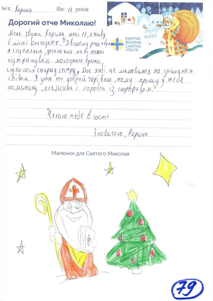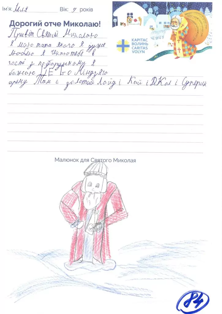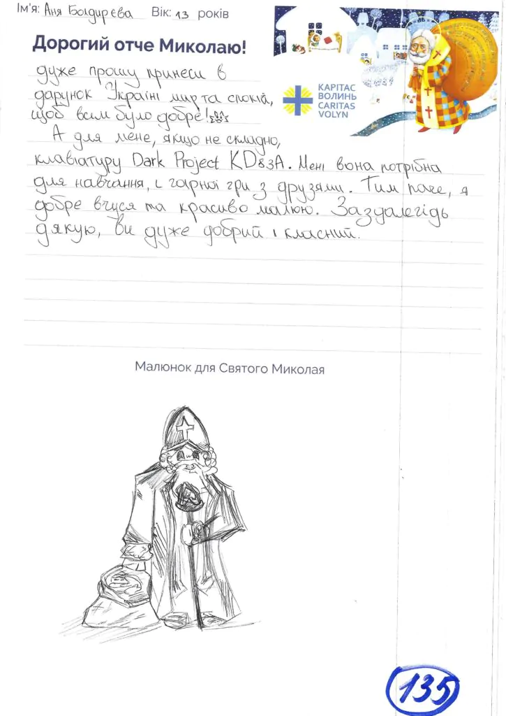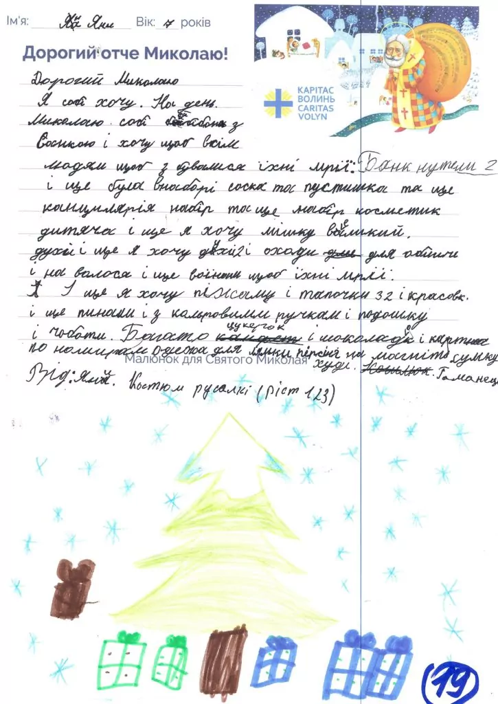 Небайдужі нововолинці обрали декілька листів задля здійснення дитячої мрії. У повідомленні до святого Миколая малеча вказала своє ім’я та вік, розповіла про родину, намалювала малюк та описала бажаний подарунок.