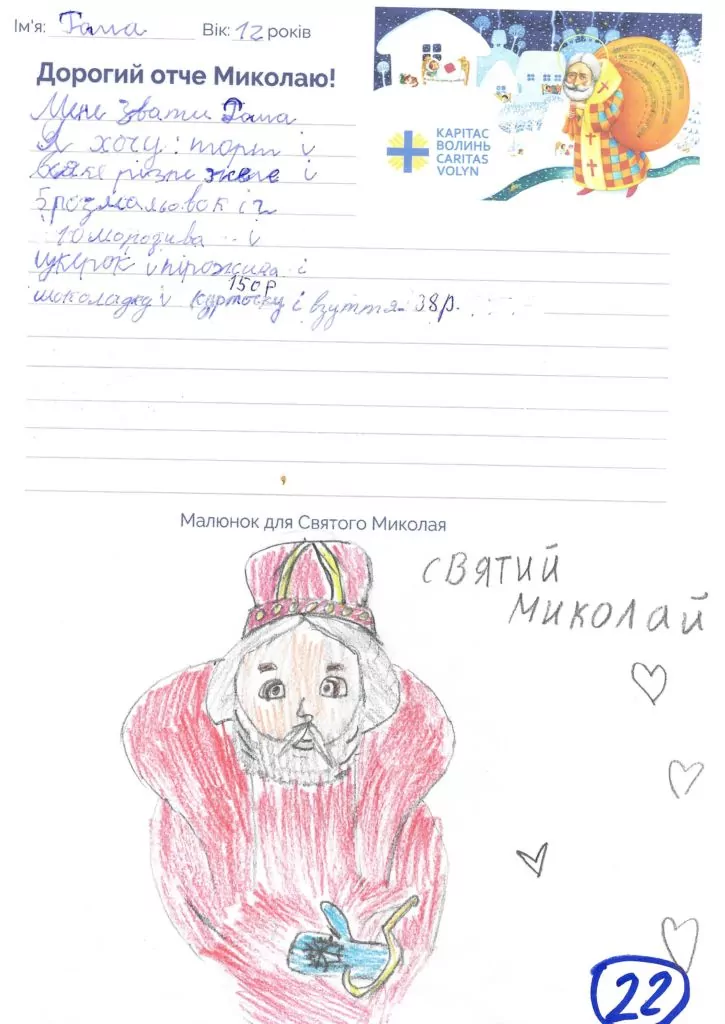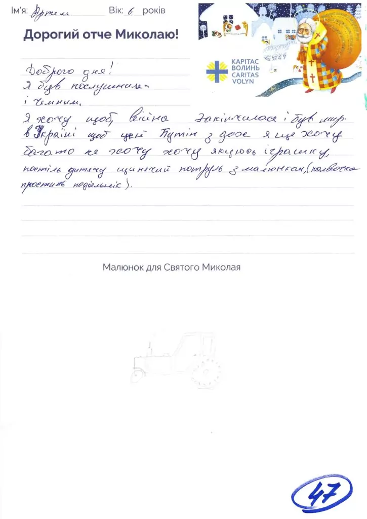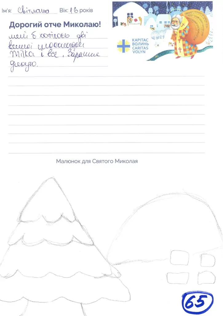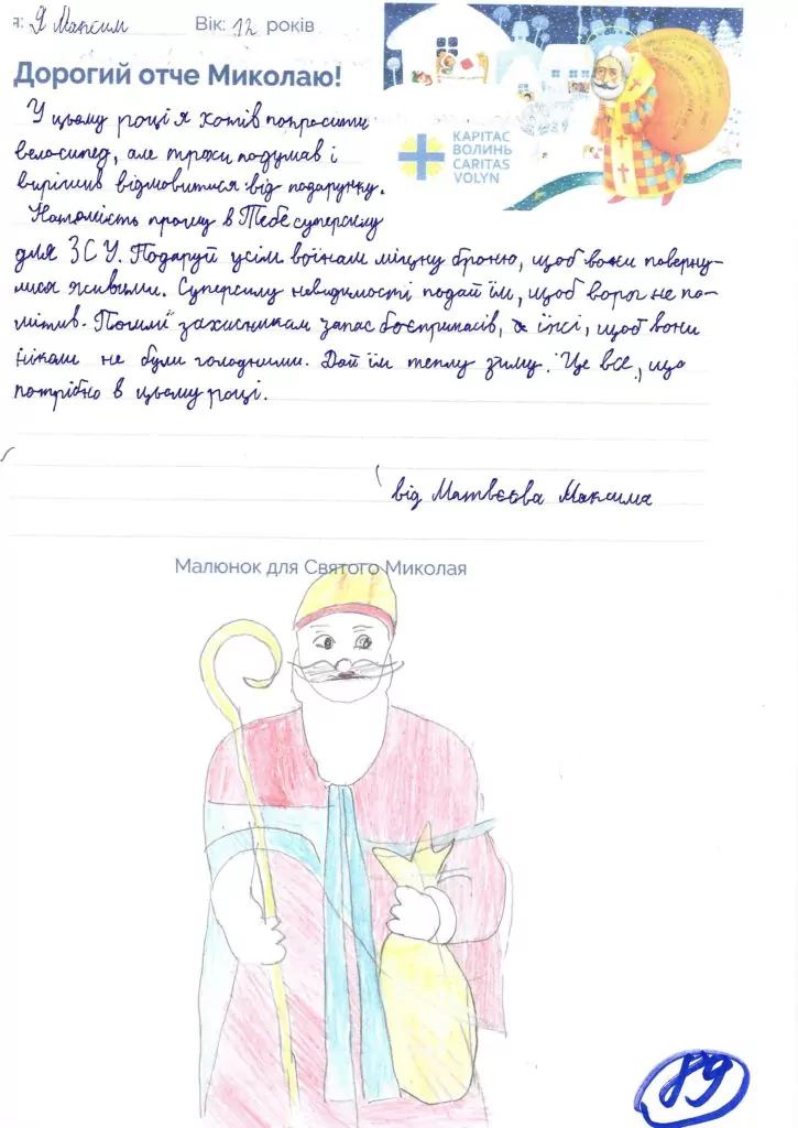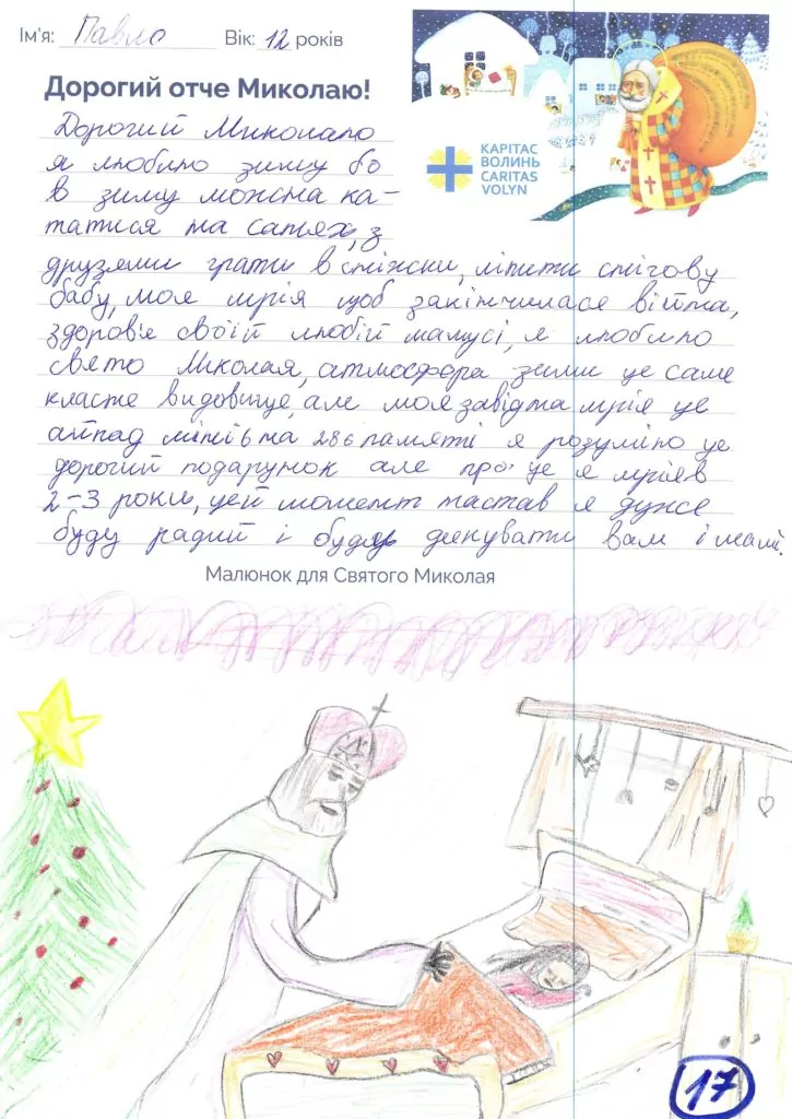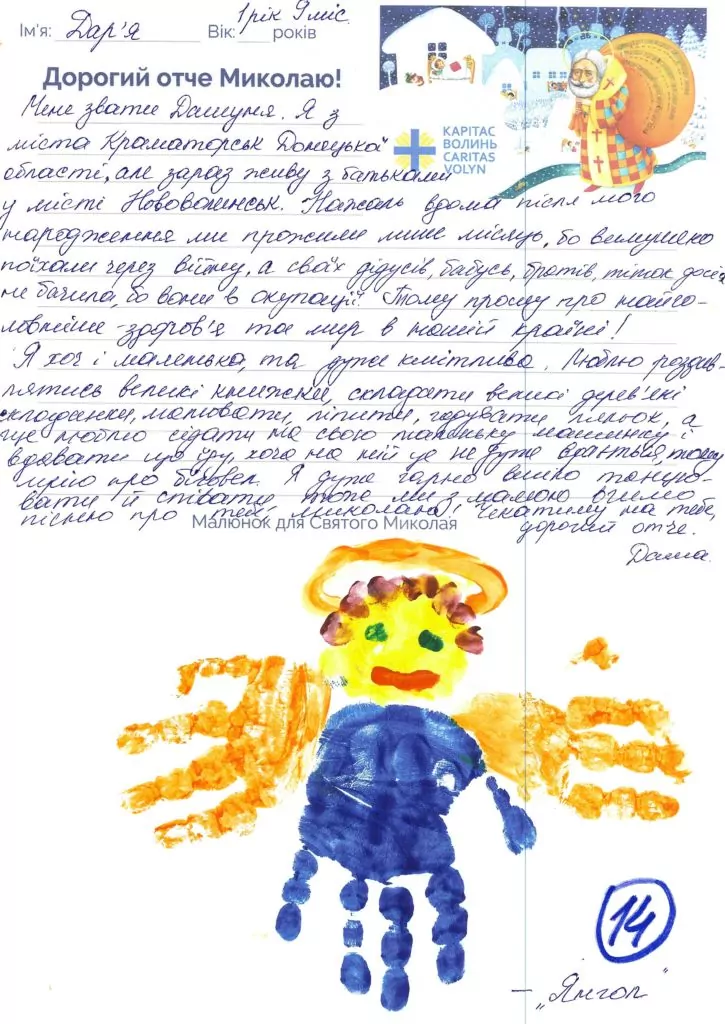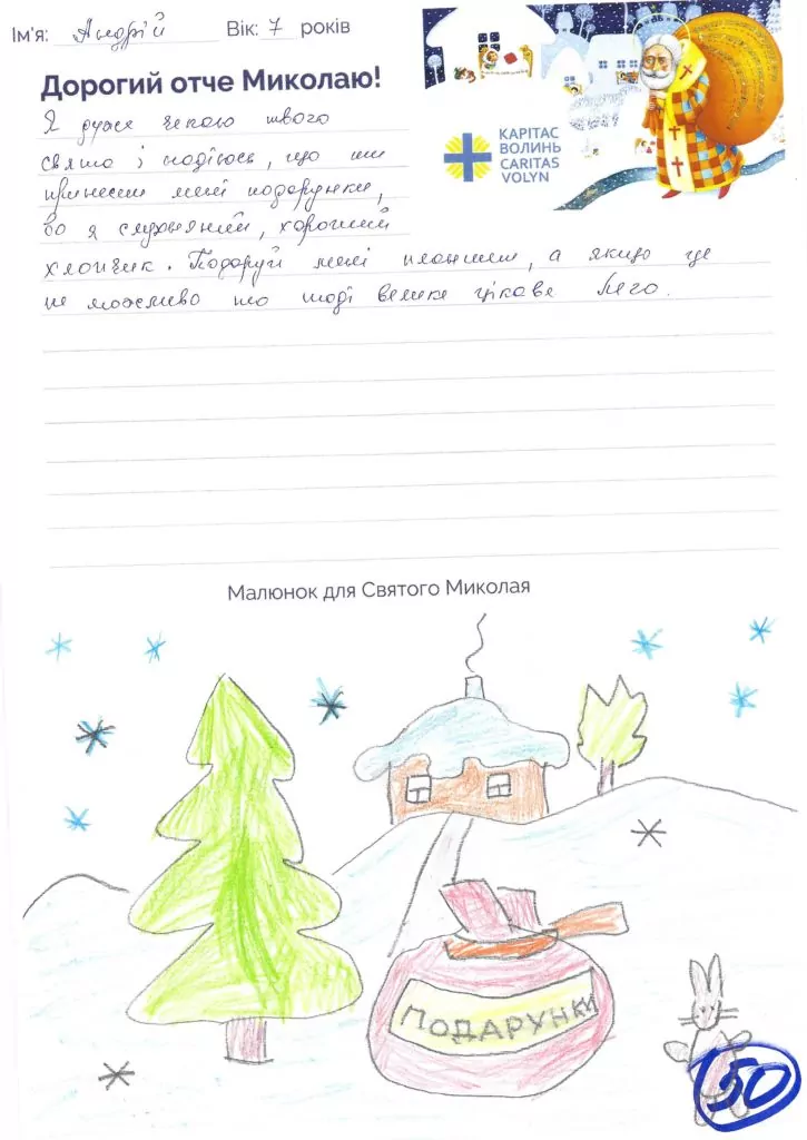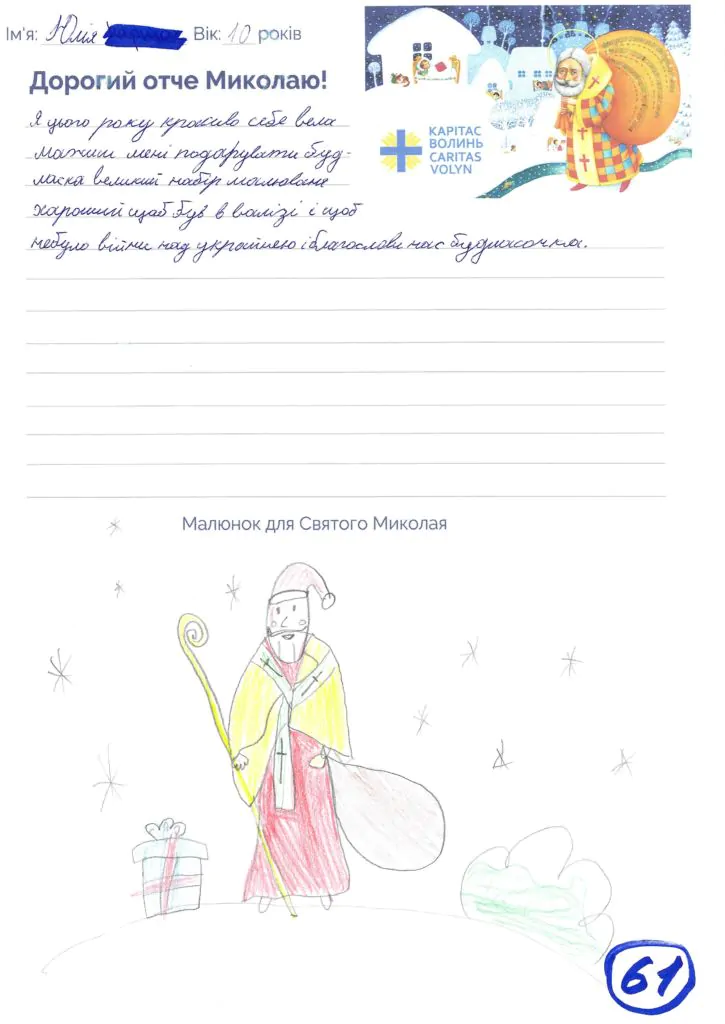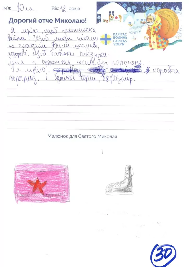 Небайдужі нововолинці обрали декілька листів задля здійснення дитячої мрії. У повідомленні до святого Миколая малеча вказала своє ім’я та вік, розповіла про родину, намалювала малюк та описала бажаний подарунок.