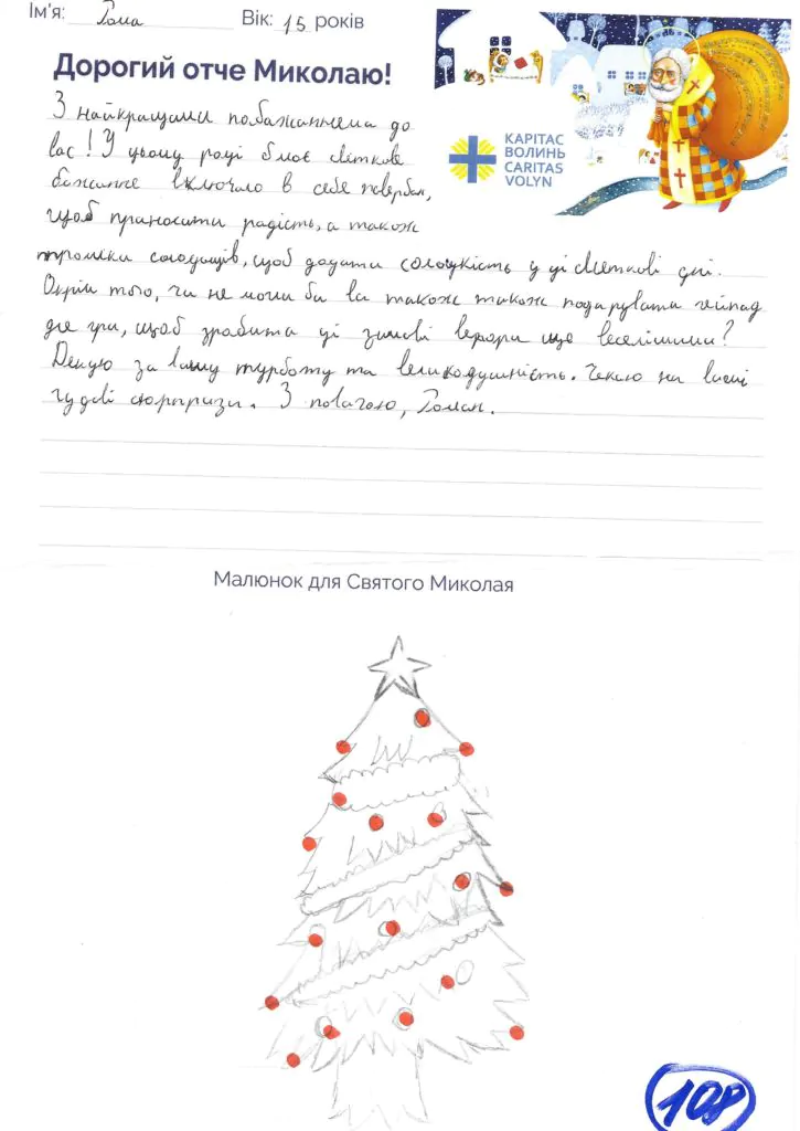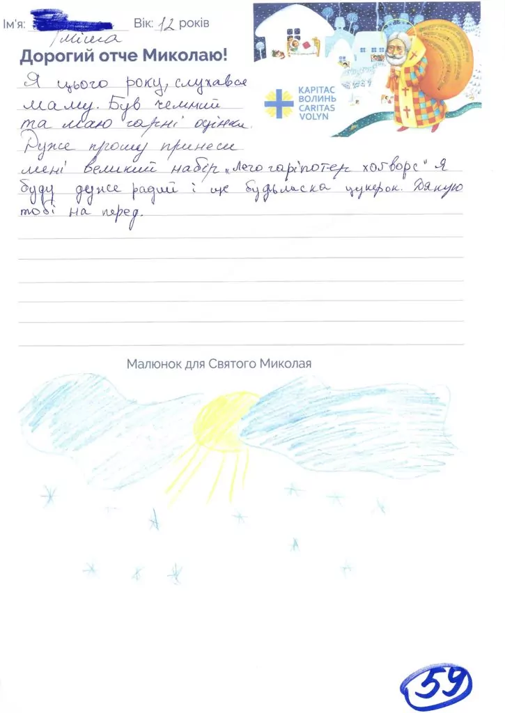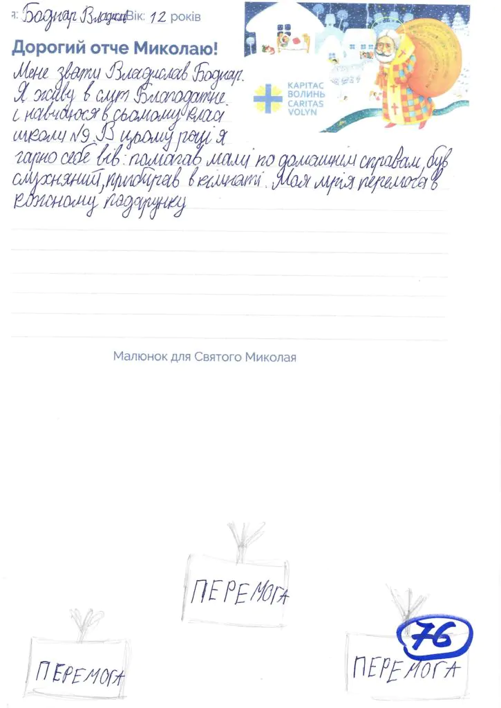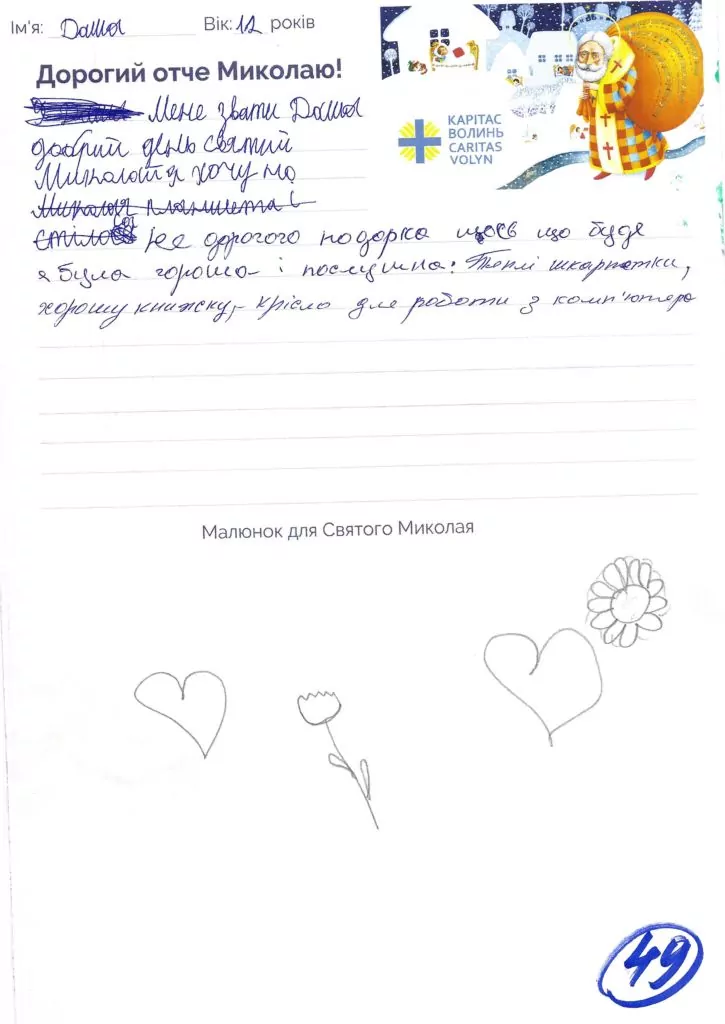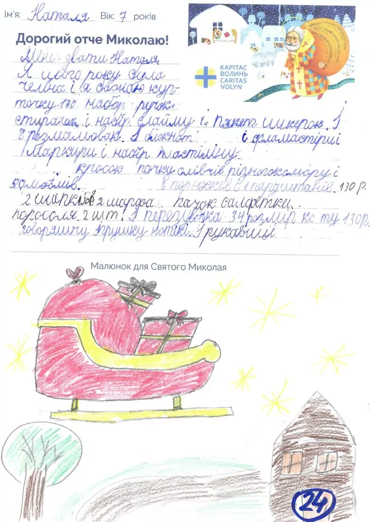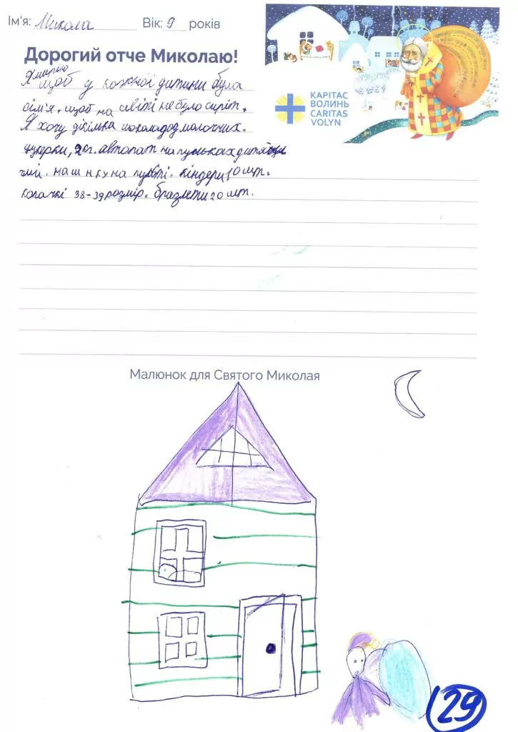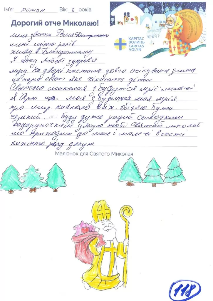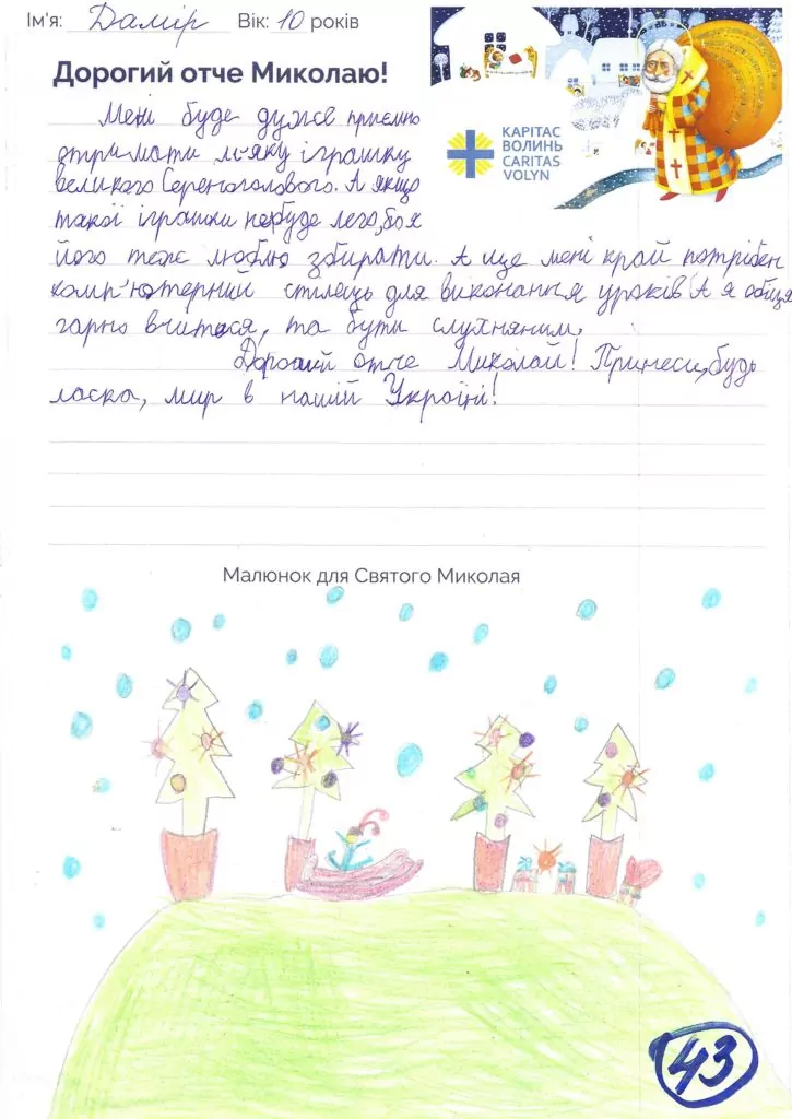 Небайдужі нововолинці обрали декілька листів задля здійснення дитячої мрії. У повідомленні до святого Миколая малеча вказала своє ім’я та вік, розповіла про родину, намалювала малюк та описала бажаний подарунок.