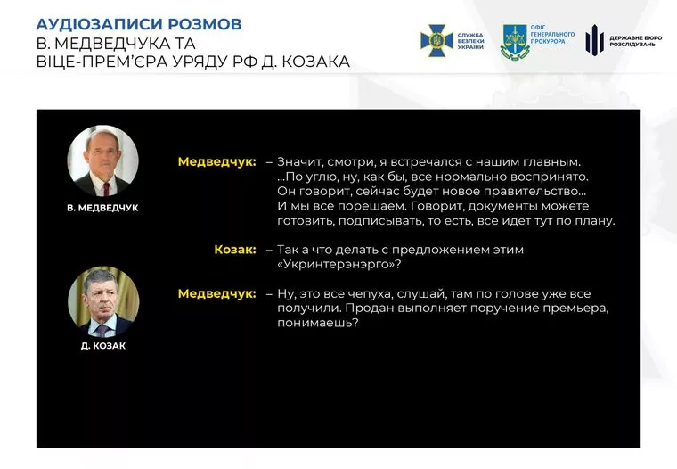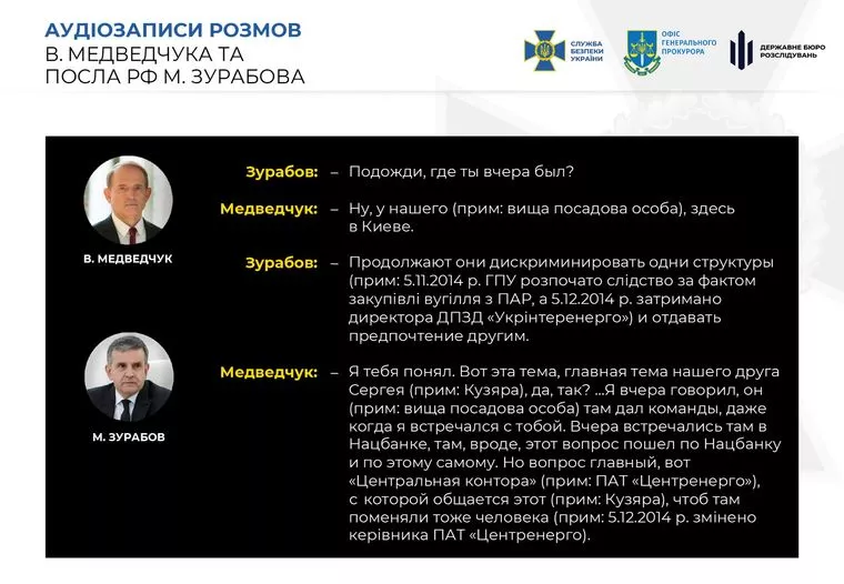 В Офісі генпрокурора стверджують, що Медведчук схиляв до цієї схеми посадовців міністерства енергетики та «Центренерго». А СБУ додає, що це підтверджують аудіозаписи розмов, один із голосів на яких, як підтвердила експертиза, належить Медведчуку.