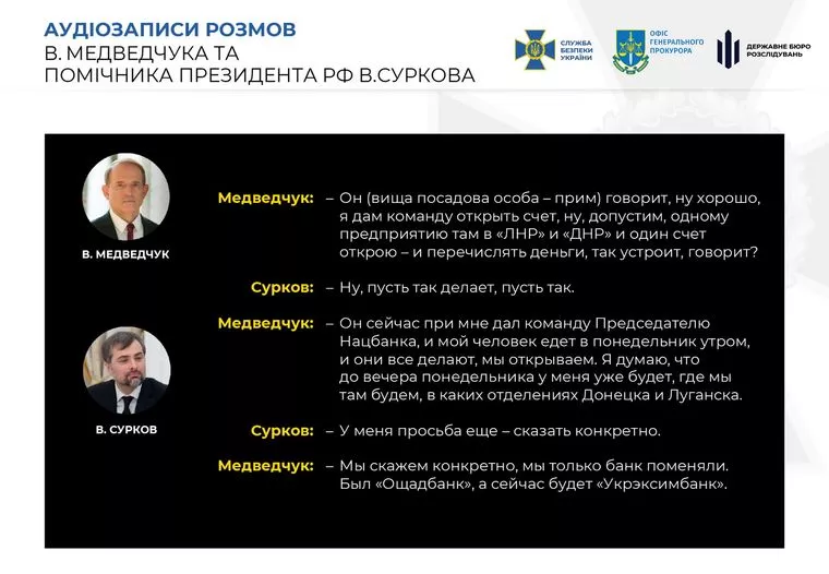 На цих записах зокрема зафіксовано, як про існування схеми Медведчук доповідав керівництву РФ. «Таким чином енергетична сфера України була поставлена у залежність від Російської Федерації та терористичних організацій», — висновують в Офісі генпрокурора.