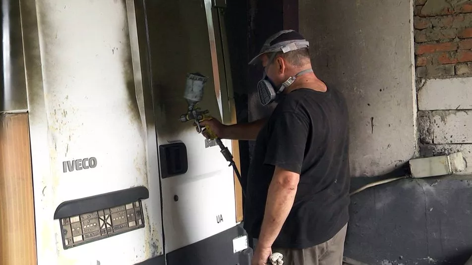 Зараз майстер перефарбовує бус військовослужбовця Сергія. Білий колір авто має змінити на темно-зелений.