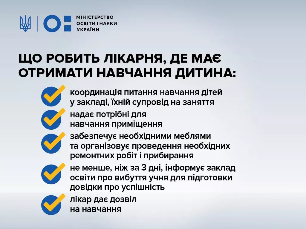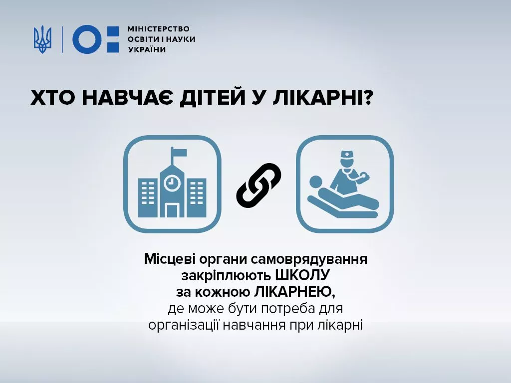 МОН та МОЗ спільним наказом затвердили положення, де є чіткий механізм забезпечення навчання при лікарні для кожної дитини, яка цього потребуватиме. Про це йдеться на сайті МОЗу.