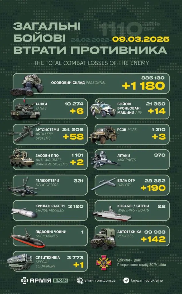 Загальні бойові втрати противника з 24.02.22 по 09.03.25 орієнтовно склали: