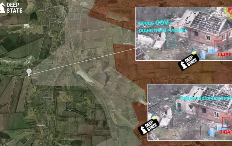 DeepState зазначає, що на опублікованому ворогом відео зафіксовано, як штурмова група російських військових бере в полон солдата Сил оборони: боєць виходить із укриття з піднятими руками, після чого одразу отримує чергу з автомата і падає на порозі будинку.