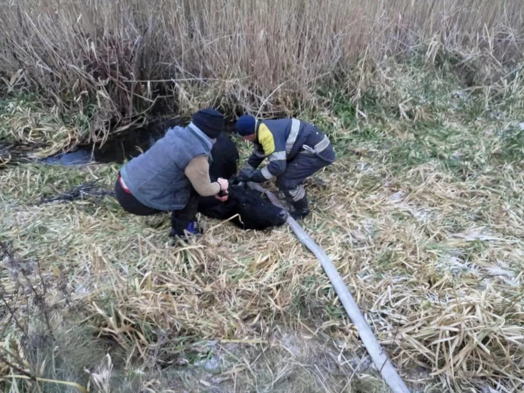 Тварина під час випасання пішла до річки на водопій та провалилася у підмерзле болото. Близько години перелякана корова перебувала у пастці. Власниця зателефонувала до Служби порятунку та попросила допомоги.