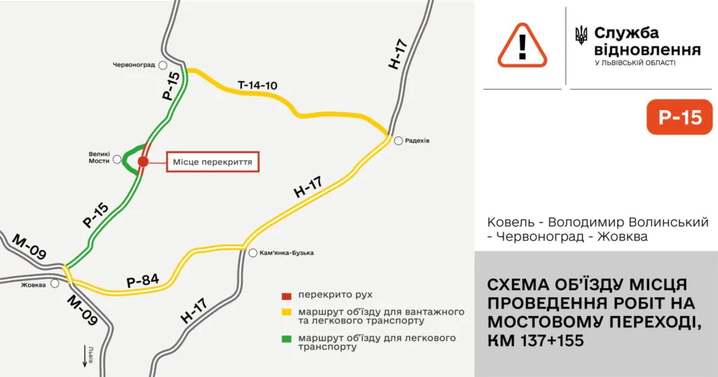 - Об’їзд перекритої ділянки для легкового транспорту буде можливим за місцевим маршрутом вулицею Старомостівською та по ділянці дороги О-140601 Рава-Руська – Гайок.