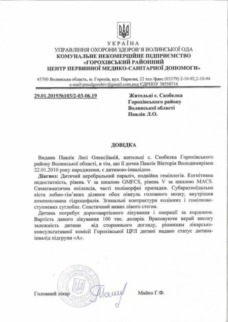 Вікторія – одна з трійнят, що народилися у родині Павліків. Дівчинка не ходить, у неї трапляються епілептичні напади. Батьки Вікторії збирають кошти на операцію в Ізраїлі – потрібно 100 тисяч доларів, – повідомляє Волинь.