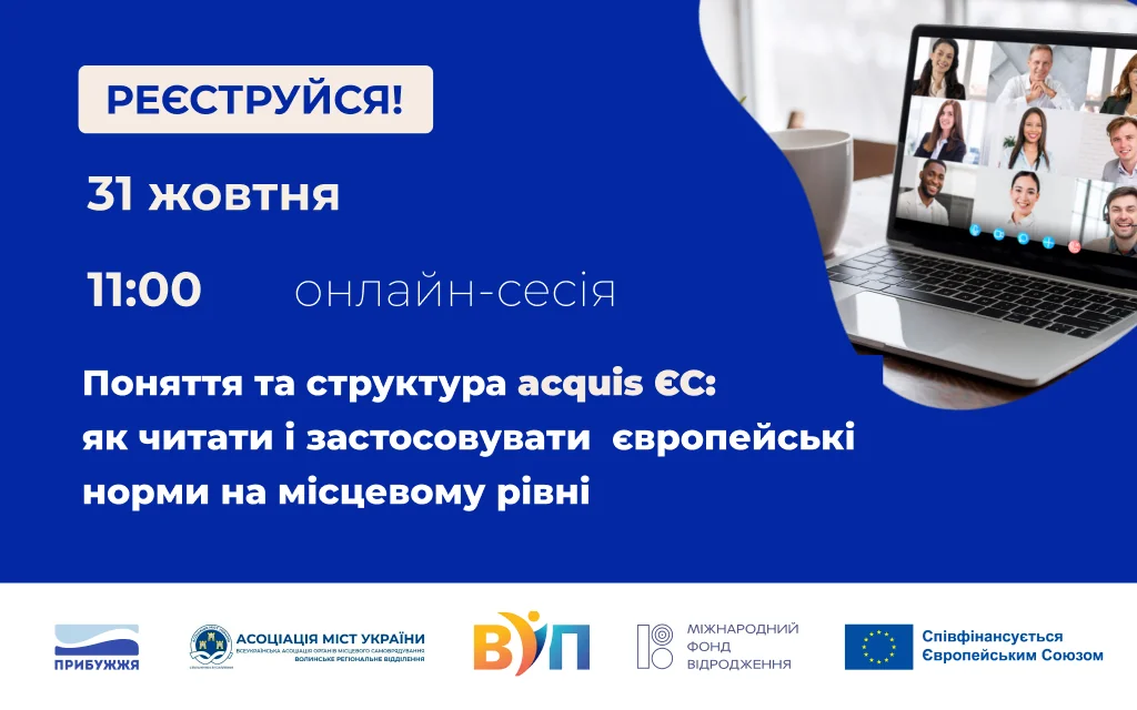 Перша онлайн-сесія має вузькоспеціалізовану та актуальну тему: «Поняття та структура acquis ЄС: як читати і застосовувати європейські норми на місцевому рівні».