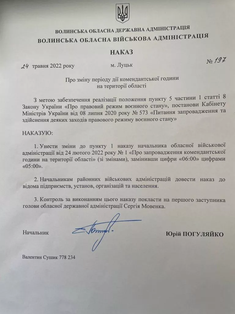 З 25-го травня на Волині період дії комендантської години змінено з 23:00 до 5:00.