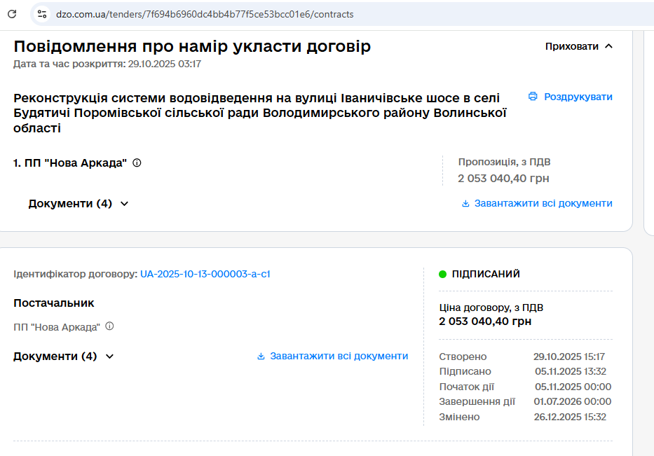 Журналісти БУГу з’ясували з відкритої інформації про тендер, що реконструкція системи водовідведення у Будятичах обійшлася громаді у 2 053 040 гривень.