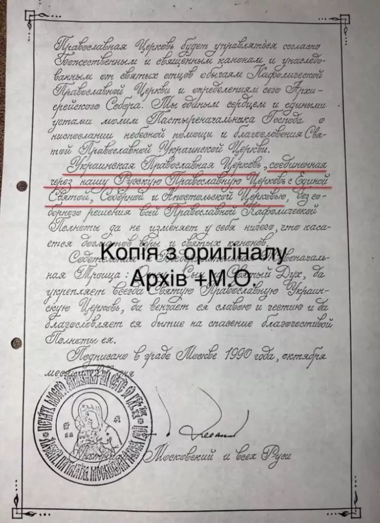 Ось фото цієї грамоти, де про це сказано (слова про те, що УПЦ з’єднана з іншими Церквами через РПЦ підкреслені червоним).