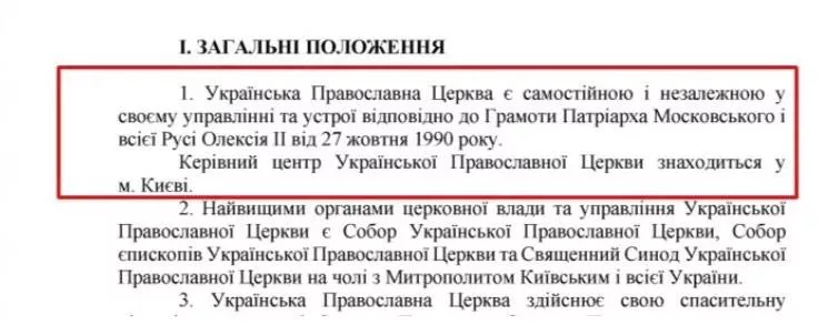 У розділі І пункті 1 сказано, що УПЦ є «самостійно і незалежною у своєму управлінні та устрої відповідно до Грамоти Патріарха Московського… Олексія ІІ від 27 жовтня 1990 року». Саме в цій грамоті зазначено, що УПЦ МП з’єднана з світовим православ’ям через Російську Православну Церкву, що унеможливлює її «самостійність» і «незалежність».