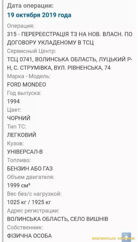 Так, журналістам Інформаційного агентства Волинські Новини стало відомо, що автомобіль Ford Mondeo 1994 року випуску чороного кольору зареєстрований у селі Вишнів Волинської області. Його власником є фізична особа. Згідно із інформацією, вказаною при реєстрації, транспортний засіб оснащений газовою установкою, яка, очевидно й стала причиною займання та вибуху.