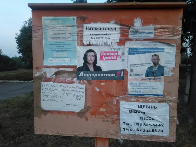 В окрузі №19 виявили агітплакати на користь двох кандидатів – Ірини Конєвої (само висування) та Сергія Гргоренка («Європейська Солідарність»). Матеріали станом на 07:30 дня голосування розміщені на дошках оголошень.