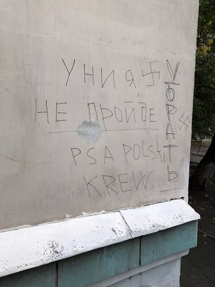 Зокрема, вандали намалювали свастику, а також польські написи “стерти це” (usunac to), “Польська собача кров” у різних інтерпретаціях (Polska psa krew, Psa polski krew), “уніати не пройдуть” (Unia nie przejdzie).