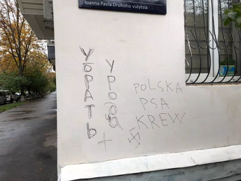 У Києві невідомі вандали залишили антипольські написи на будинку № 2 на бульварі Марії Приймаченко, де в неділю, 15 жовтня, за участю мера Києва та послів Польщі та Ватикану в Україні планується урочисте відкриття муралу з образом святого Іоанна Павла ІІ.