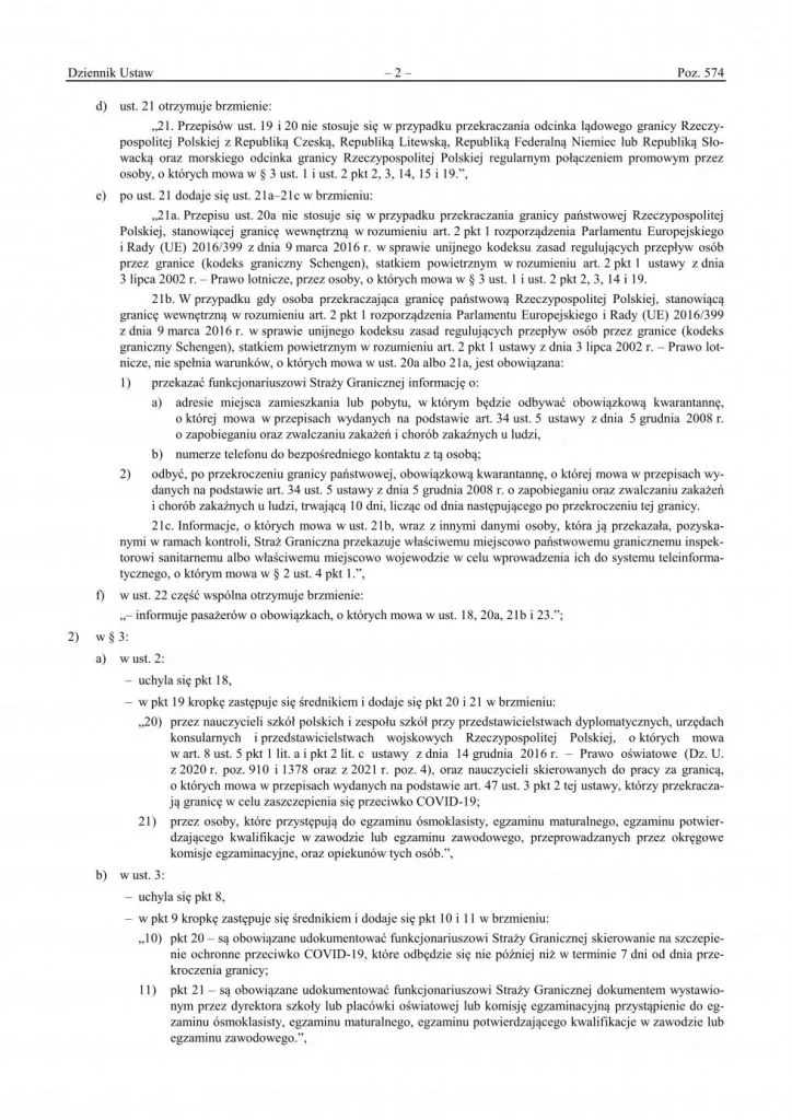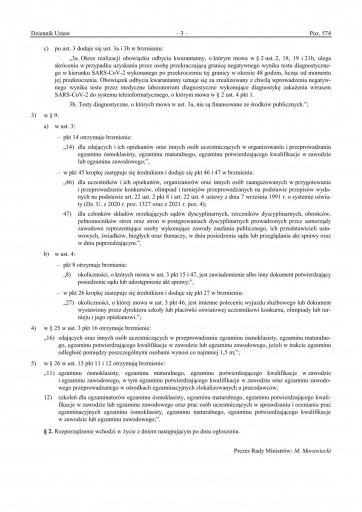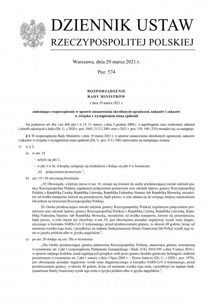 Документ набрав чинності з 30-го березня 2021 року. Окрім того, що він запровадив нові правила відбування карантину для приїжджих до Польщі, прописано також винятки. Це – категорії осіб, які все ж таки будуть звільнятися від обов’язкового карантину після перетину польського кордону без необхідності виконання тестів.