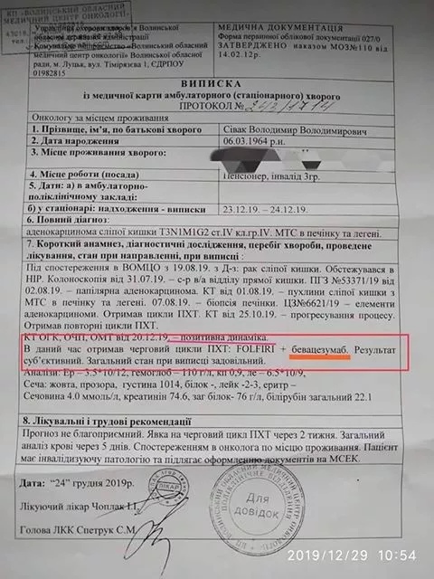 Мешканцю Нововолинська Володимиру Сіваку лікарі поставили діагноз рак 4-ої стадії сліпої кишки з метазтазами в печінці та легенях. На даний час чоловік пройшов сім хімій, з них чотири з додаванням таргентного препарату Авастин, який є дуже дорогим.