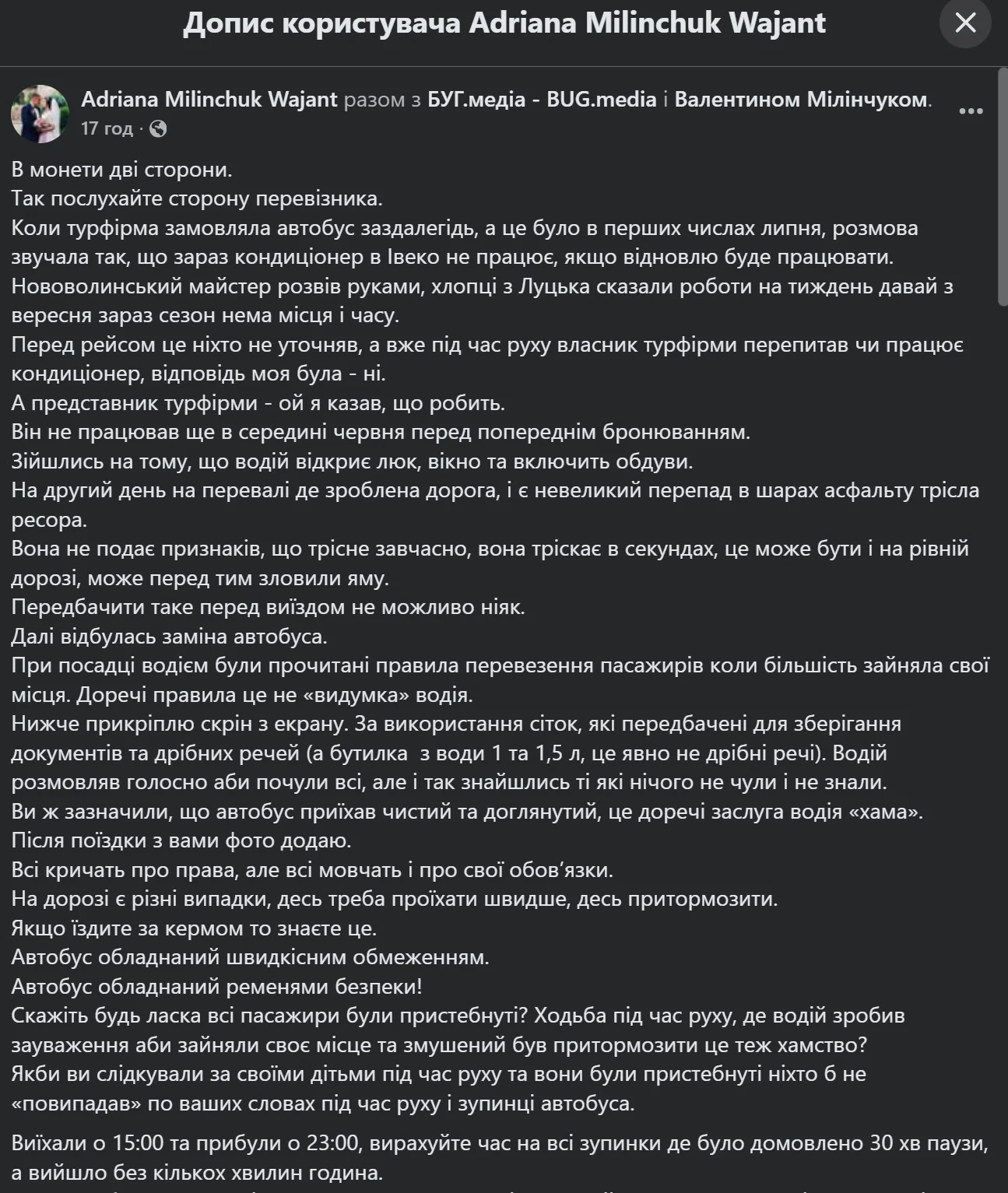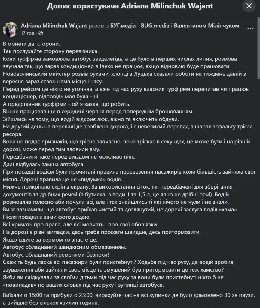 Після скандалу з поїздкою до Карпат, коли нововолинці поскаржилися на принизливі правила та поведінку водія автобуса, у справі з’явилася публічна відповідь другої сторони. Представниця перевізника, якого назвали у дописі – ФОП Валентин Мілінчук – Адріана Мілінчук опублікувала свою версію подій. Проте в коментарях під цим постом нова хвиля критики.