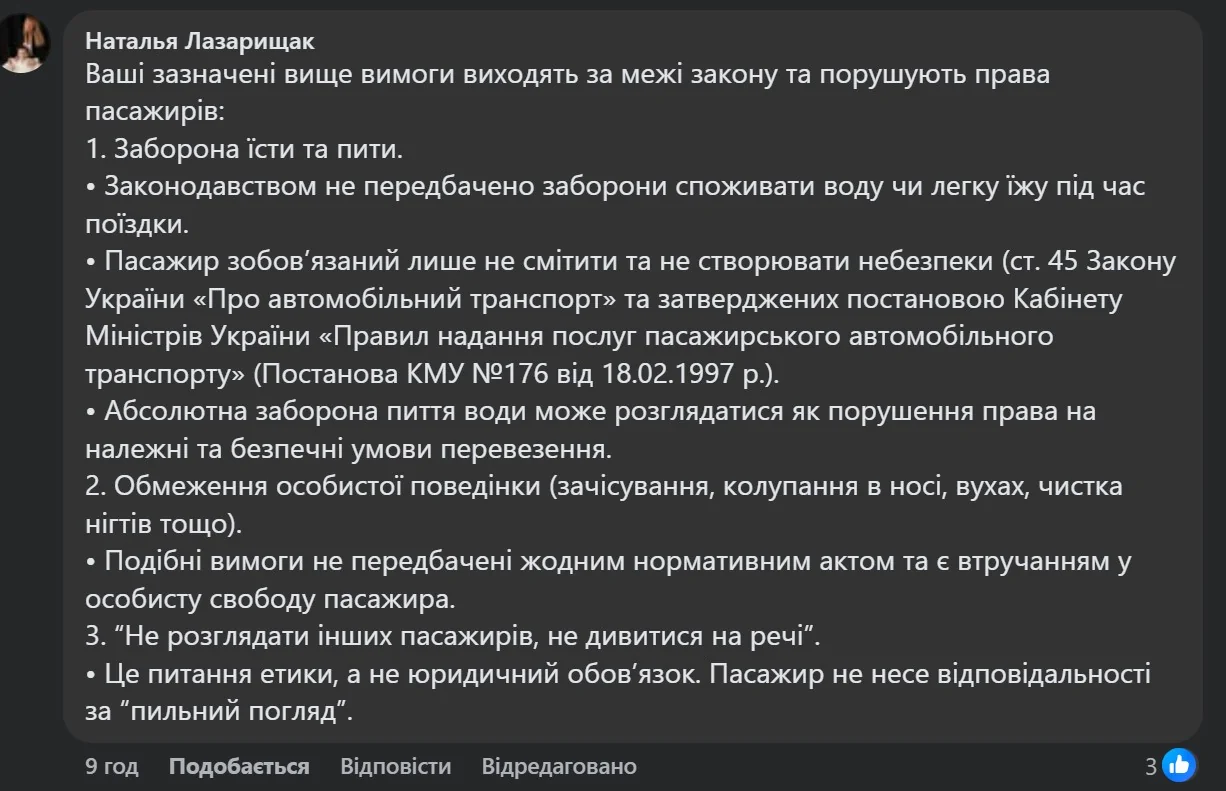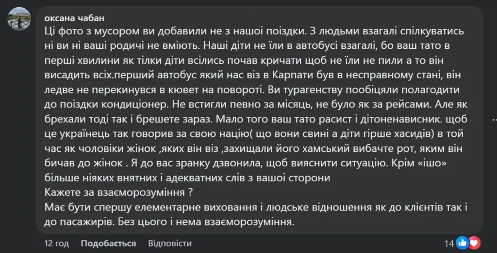 Представник перевізника, як видно з допису, захищає водія, бо слово “хам” пише в лапках. В дописі зазначається, що саме завдяки водієві автобус був у доброму стані й чистоті. У пості також зазначено, що всі пасажири не мають ігнорувати обов’язки, і якщо заплатив за перевезення – це не означає, що можна смітити.