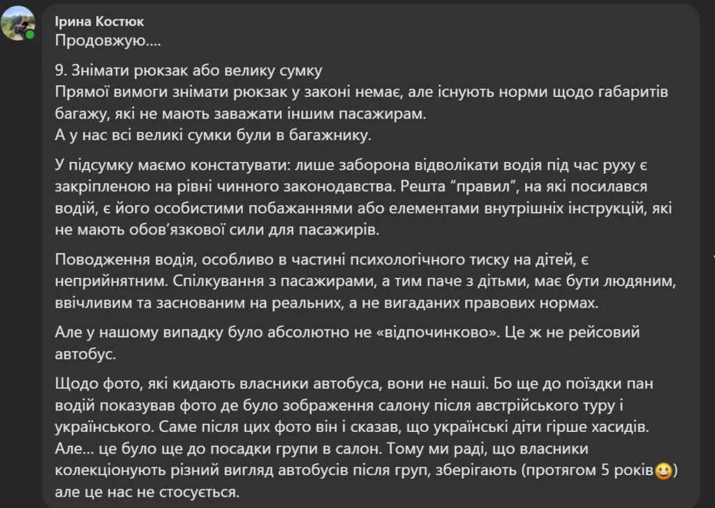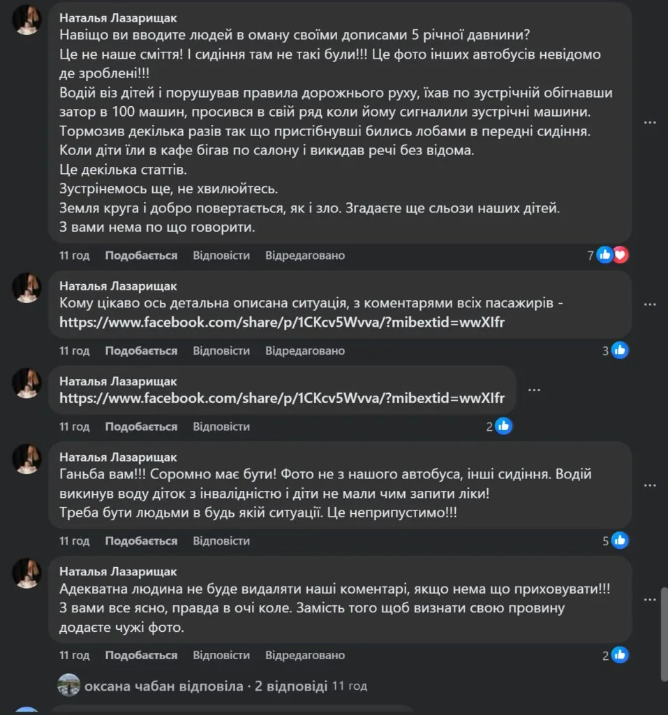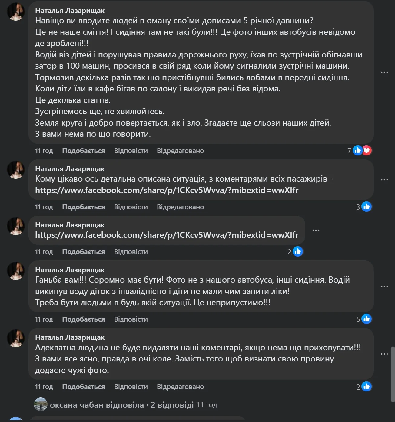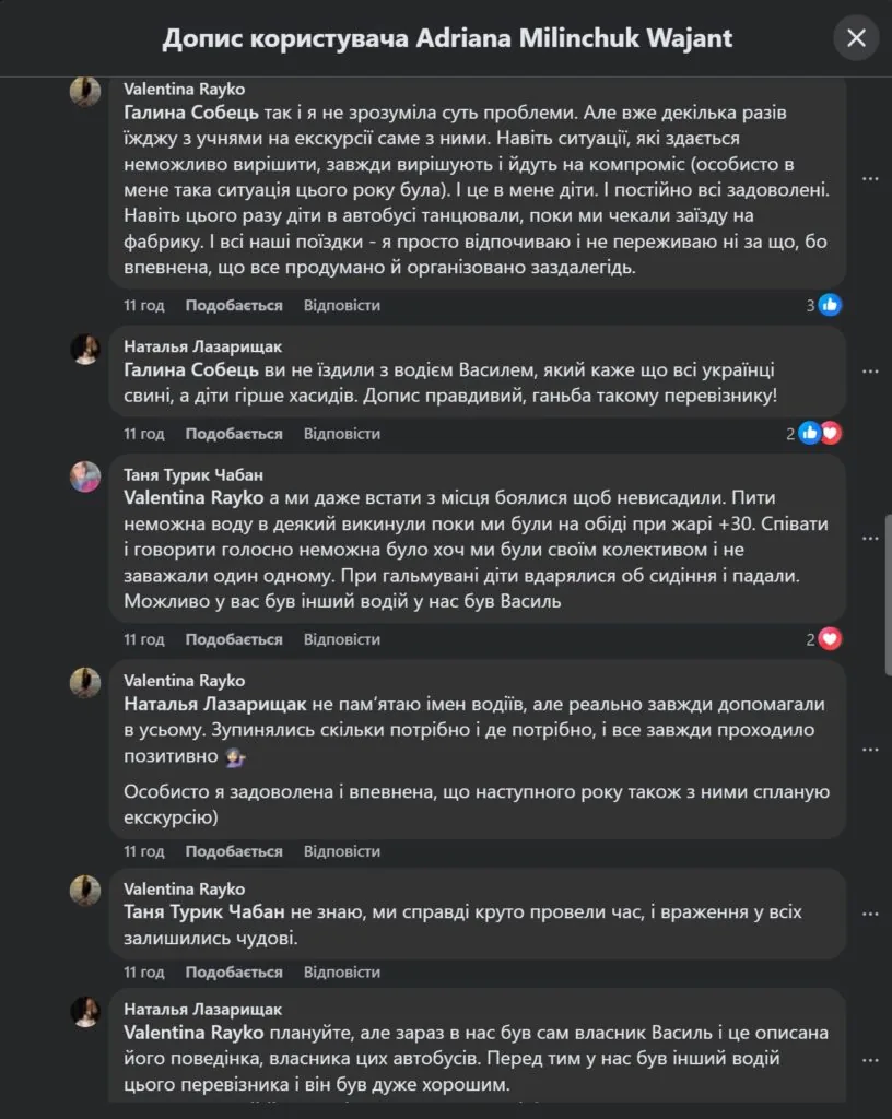 Після публікації допису Адріани Мілінчук ситуація у кометарях загострилася. Люди пишуть, що фото не з їхнього автобусу, а це фотозбірка водія, яку він демонстрував і їм під час поїздки, говорячи що “українські діти гірше хасидів”. Це було, за словами жінок, дуже неприємно.