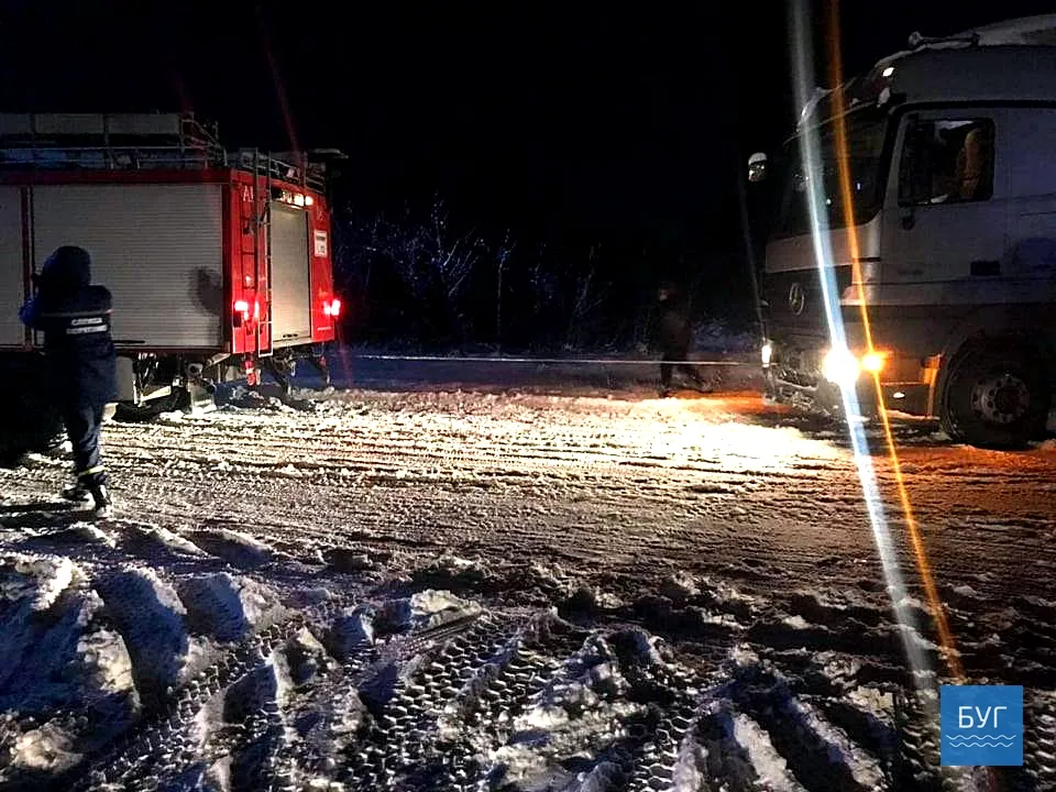 “17-го грудня о 17:02 надійшло повідомлення про те, що вантажний автомобіль марки “Мерседес” з’їхав з дороги на повороті до Благодатного, виконуючи маневр розвороту. Водій повідомив нам, що вантажівку розвернуло впоперек дороги і він не може виїхати.