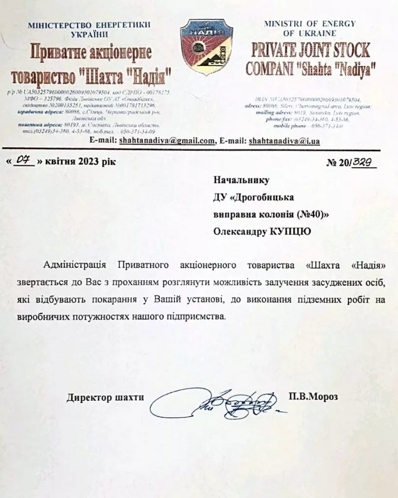 Народний депутат, голова Конфедерації Вільних профспілок України Незалежної профспілки гірників України Михайло Волинець опублікував лист ніби від директора шахти «Надія», що у Львівській області, до начальника Дрогобицької колонії з проханням розглянути можливість залучення засуджених осіб до підземних робіт на їхній шахті.