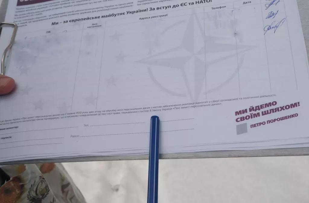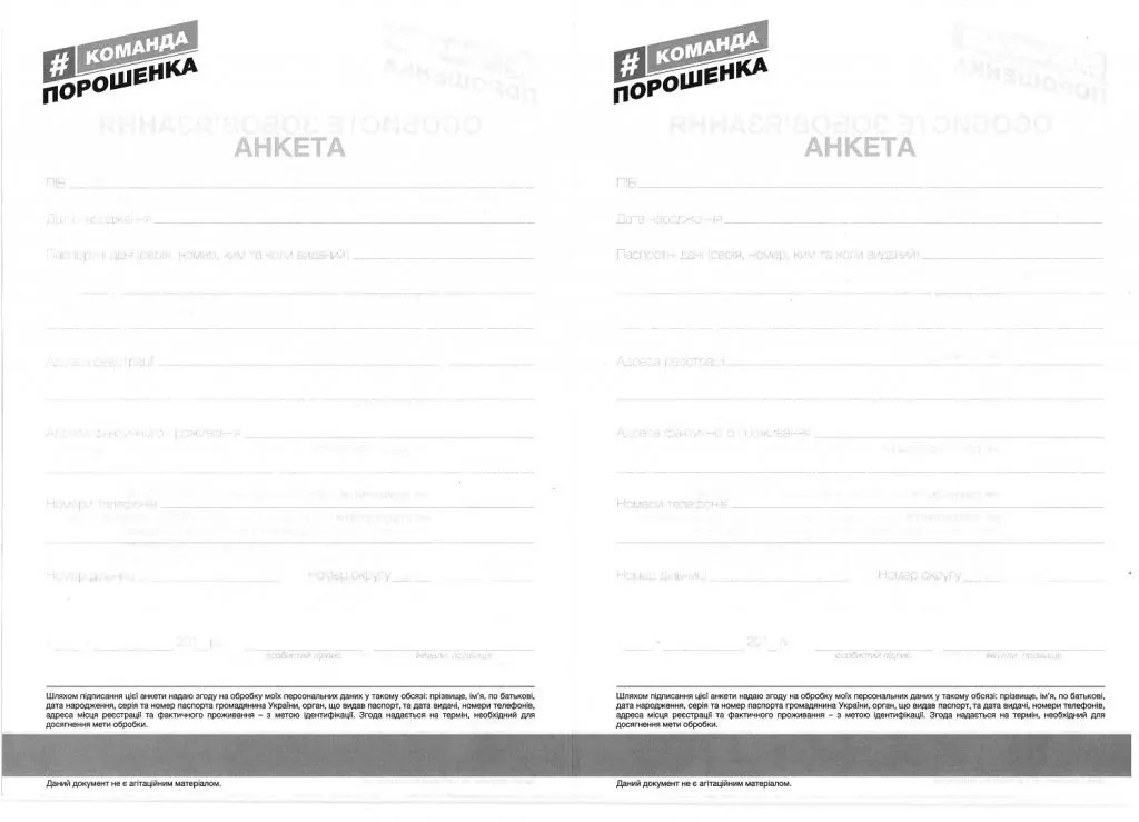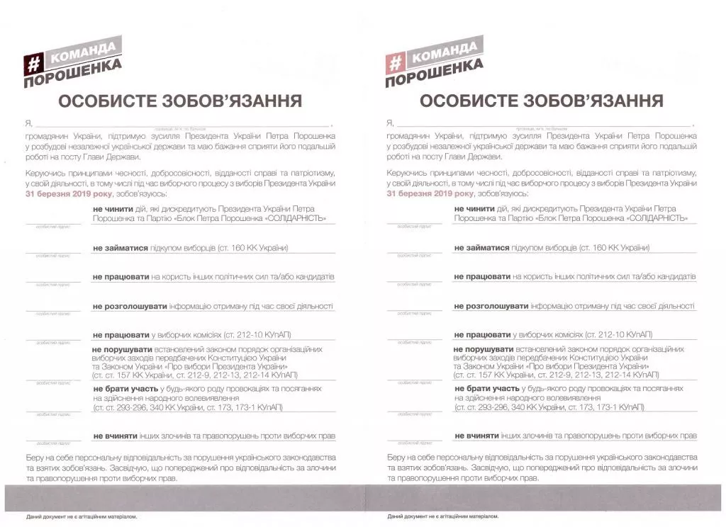 Дали також бланк «особистого зобов’язання» з логотипом «#команда Порошенка». Підписуючи зобов’язання, громадяни мають засвідчити свою підтримку «зусиль Президента України Петра Порошенка у розбудові незалежної української держави» та бажання «сприяти його подальшій роботі на посту Глави Держави».