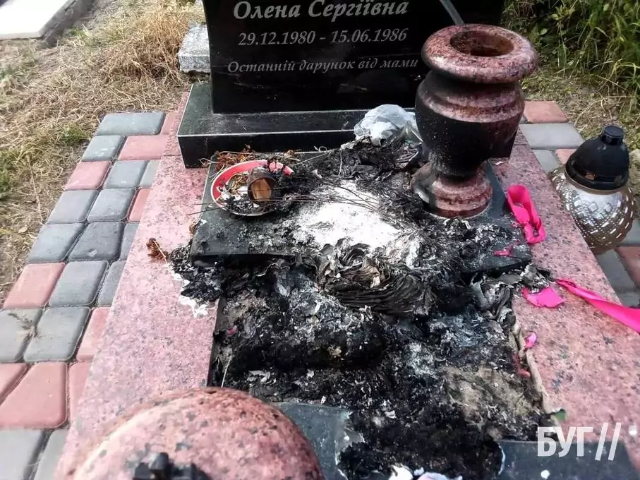 Вандали познімали стрічки, квіти, які були на могилі, відкрили скриньку з реманентом під лавкою, принесли власну книгу, м’яку іграшку і все це підпалили на могилі. Жінка викликала правоохоронців.