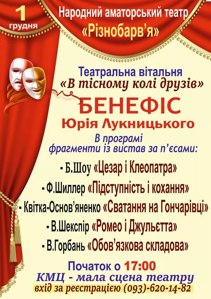 01.12 п’ятниця, 17:00 – Народний аматорський театр «Різнобарв’я». Театральна вітальня «В тісному колі друзів».