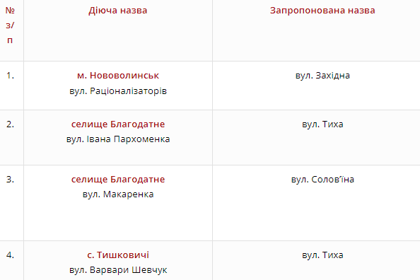 Нагадаємо, у Нововолинській громаді планують перейменувати: вулицю Раціоналізаторів у Нововолинську, вулиці Пархоменка та Макаренка у селищі Благодатному, вулицю Варвари Шевчук у с. Тишковичі.