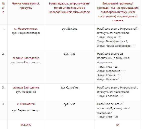 Від учасників громадських обговорень стосовно перейменування вулиць на території Нововолинської громади надійшло пропозицій (в тому числі під час анкетування – 64), з них 59 жителя громади підтримали назви вулиць, запропоновані топонімічною комісією Нововолинської міської ради, 5 жителів громади висловили власні пропозиції щодо перейменування.